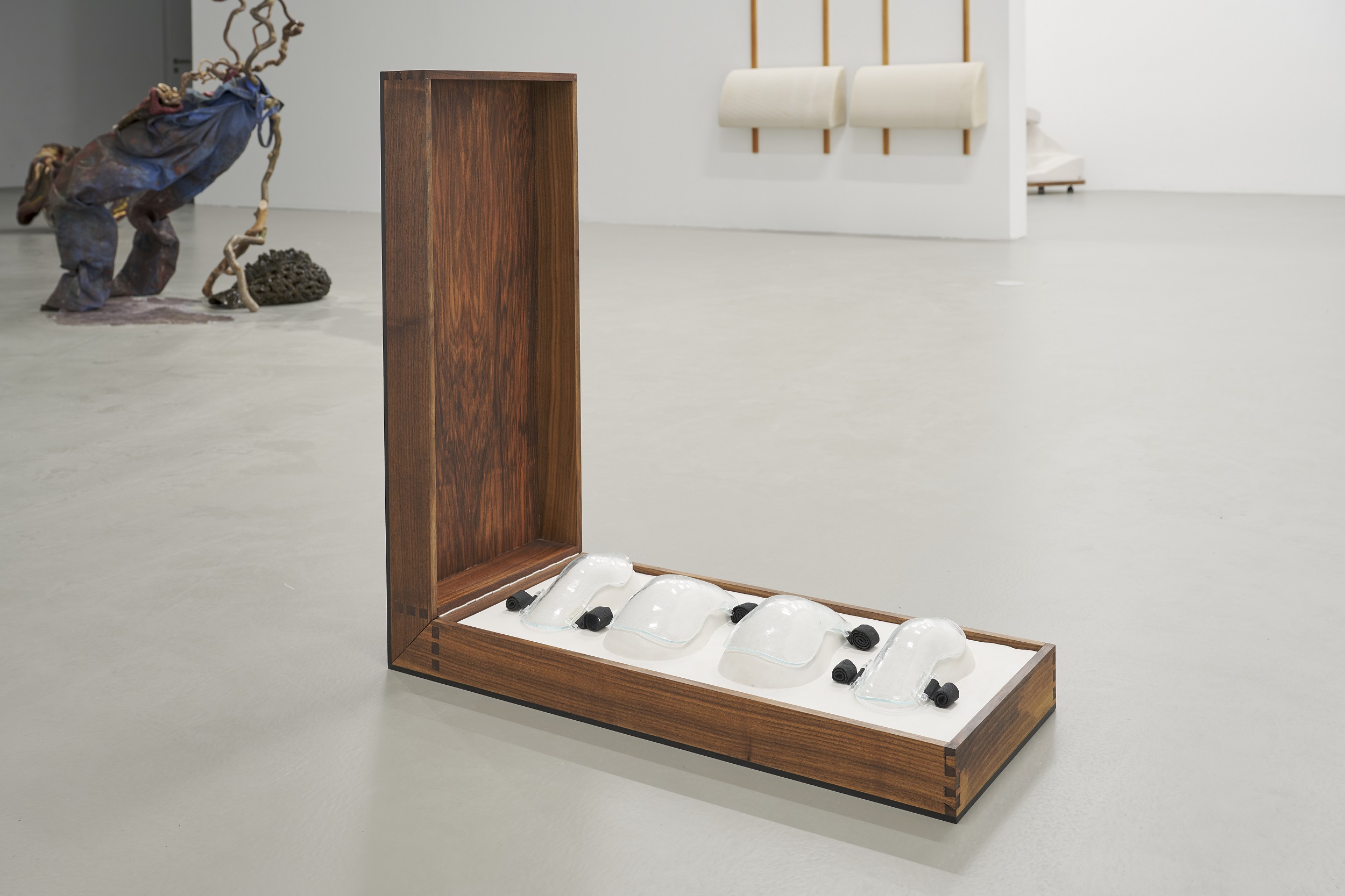 Die künstlerische Arbeit PSA von Hannah Mischkowski (Klasse Prof. Thomas Demand) überzeugte die Jury durch ihre Vielschichtigkeit und formale Stringenz am meisten und wird mit dem Hiscox Kunstpreis in Höhe von 7.500 Euro bedacht. In der Jurybegründung heißt es: „Die Betrachtenden nähern sich einem hölzernen Kasten, der gläserne Schutzvorrichtungen für Ellbogen und Knie enthält, die als Hilfsmittel dienen, hier jedoch durch ihre Fragilität überraschen. Das Zusammenspiel von Glas-Objekten und stabilem Gehäuse betont die Verletzlichkeit des Menschen, den Balanceakt zwischen Risiko und Sicherheit. In Zeiten, die geprägt sind von Zukunftsangst, Konkurrenzdruck und konkreter Bedrohung durch Krieg und Fremdenfeindlichkeit werten wir Hannah Mischkowskis Beitrag als starken Ausdruck für die soziale Wirklichkeit in unserer Gegenwart.“