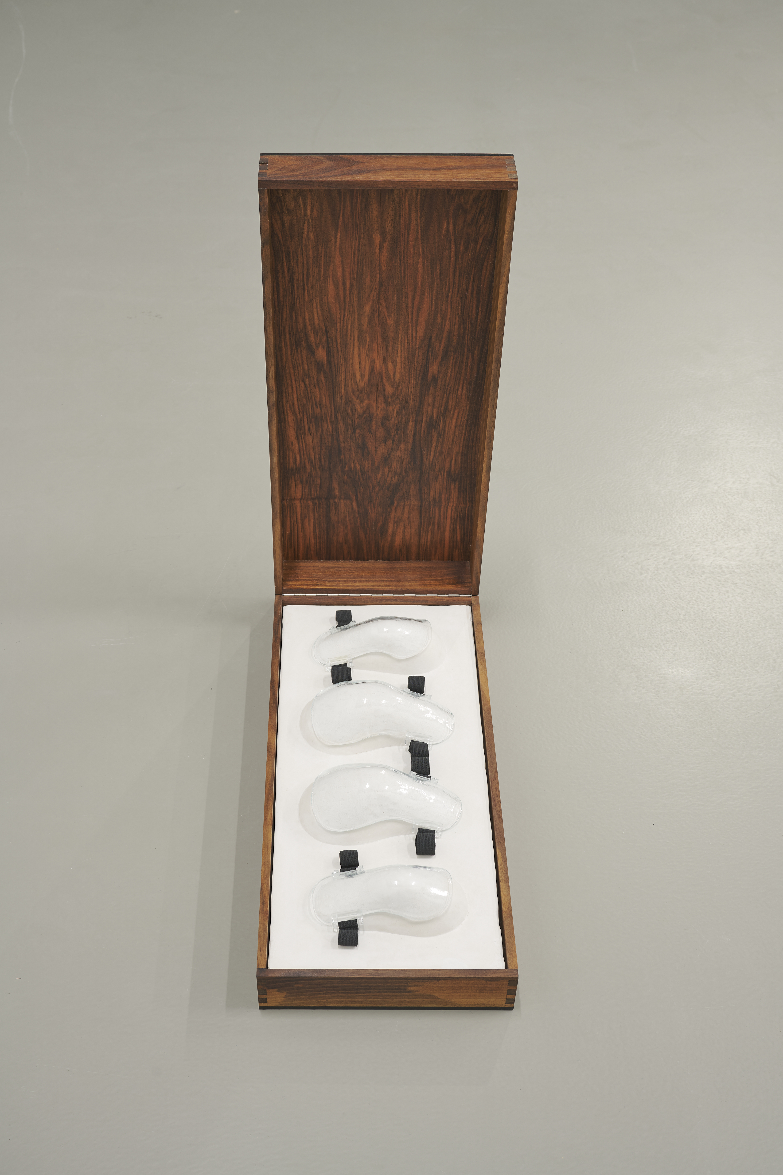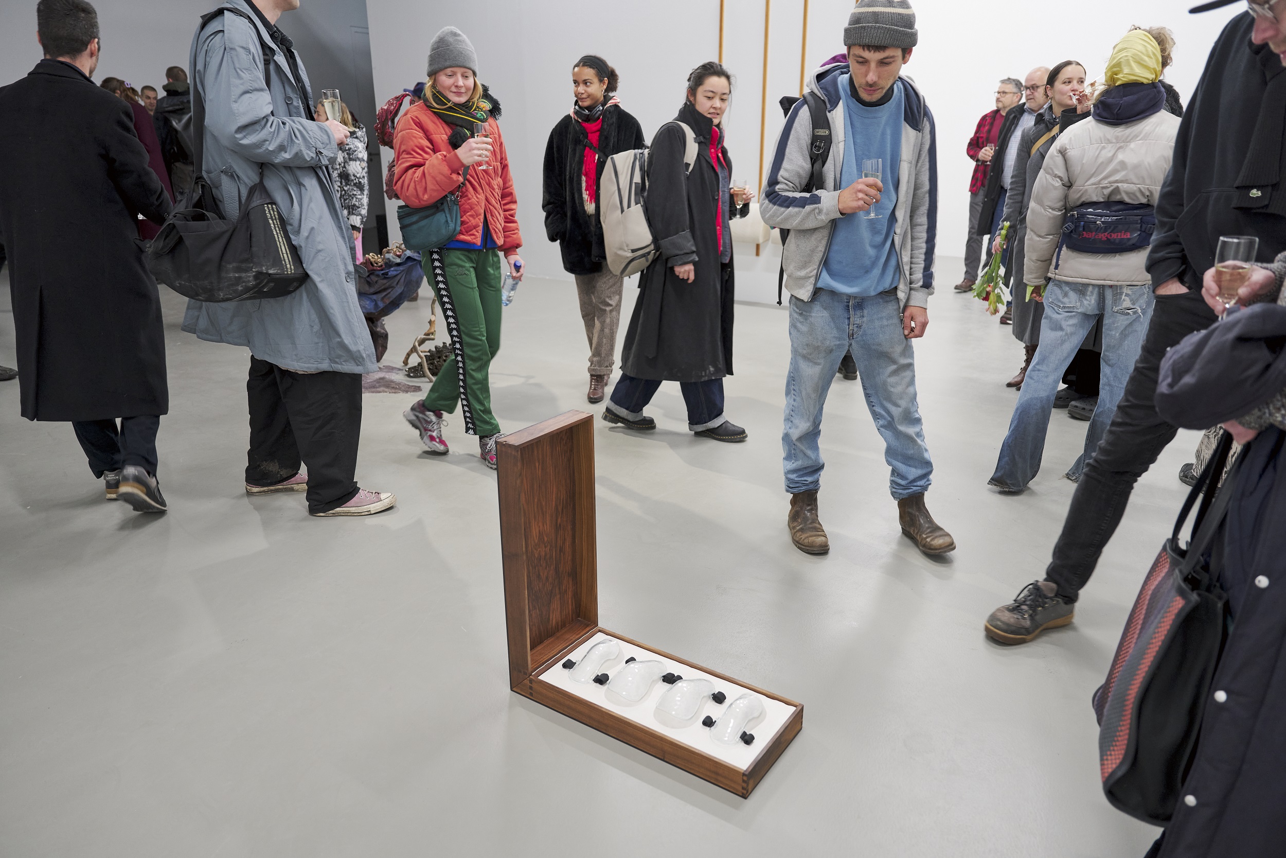 Die künstlerische Arbeit PSA von Hannah Mischkowski (Klasse Prof. Thomas Demand) überzeugte die Jury durch ihre Vielschichtigkeit und formale Stringenz am meisten und wird mit dem Hiscox Kunstpreis in Höhe von 7.500 Euro bedacht. In der Jurybegründung heißt es: „Die Betrachtenden nähern sich einem hölzernen Kasten, der gläserne Schutzvorrichtungen für Ellbogen und Knie enthält, die als Hilfsmittel dienen, hier jedoch durch ihre Fragilität überraschen. Das Zusammenspiel von Glas-Objekten und stabilem Gehäuse betont die Verletzlichkeit des Menschen, den Balanceakt zwischen Risiko und Sicherheit. In Zeiten, die geprägt sind von Zukunftsangst, Konkurrenzdruck und konkreter Bedrohung durch Krieg und Fremdenfeindlichkeit werten wir Hannah Mischkowskis Beitrag als starken Ausdruck für die soziale Wirklichkeit in unserer Gegenwart.“