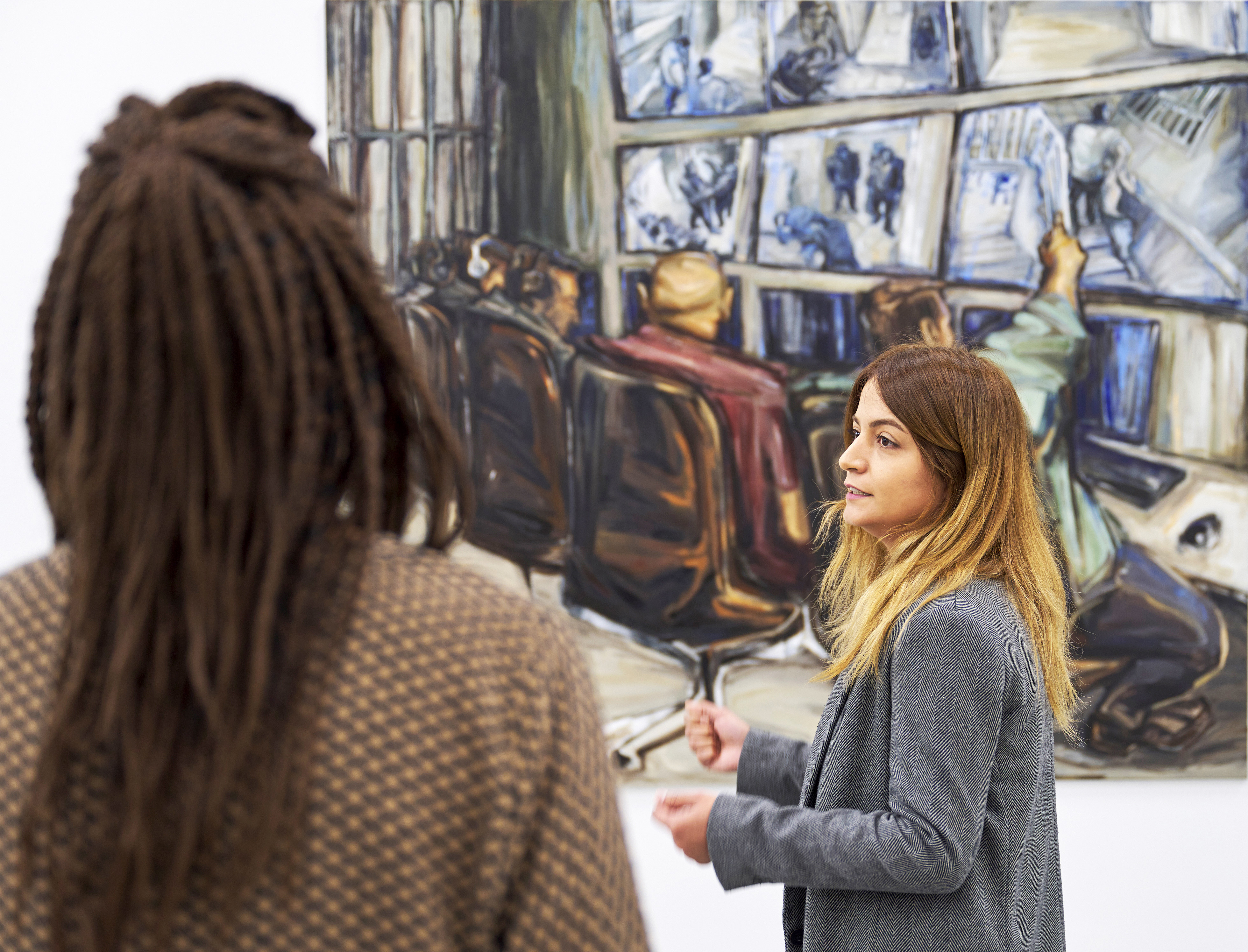Simin Jalilian, die nach einem Bachelor-Studium in Teheran seit 2017 in Hamburg bei Werner Büttner und Rajkamal Kahlon studiert, beweist in ihrer Malerei eine subjektive gestische Handschrift, die Figuration in eine freie, lebendige Bildsprache übersetzt. Ihre Arbeiten thematisieren verschiedene Ebenen männlicher Machtpositionen, Gewalt und Unterdrückungsmechanismen. Durch Farbe, Licht und Komposition schafft sie es, bedrohliche Atmosphären von politischen Realitäten auf ihren Öl-Bildern festzuhalten, die sprechend mit Spezialkräfte, Big Brother is watching you oder The War betitelt sind.
